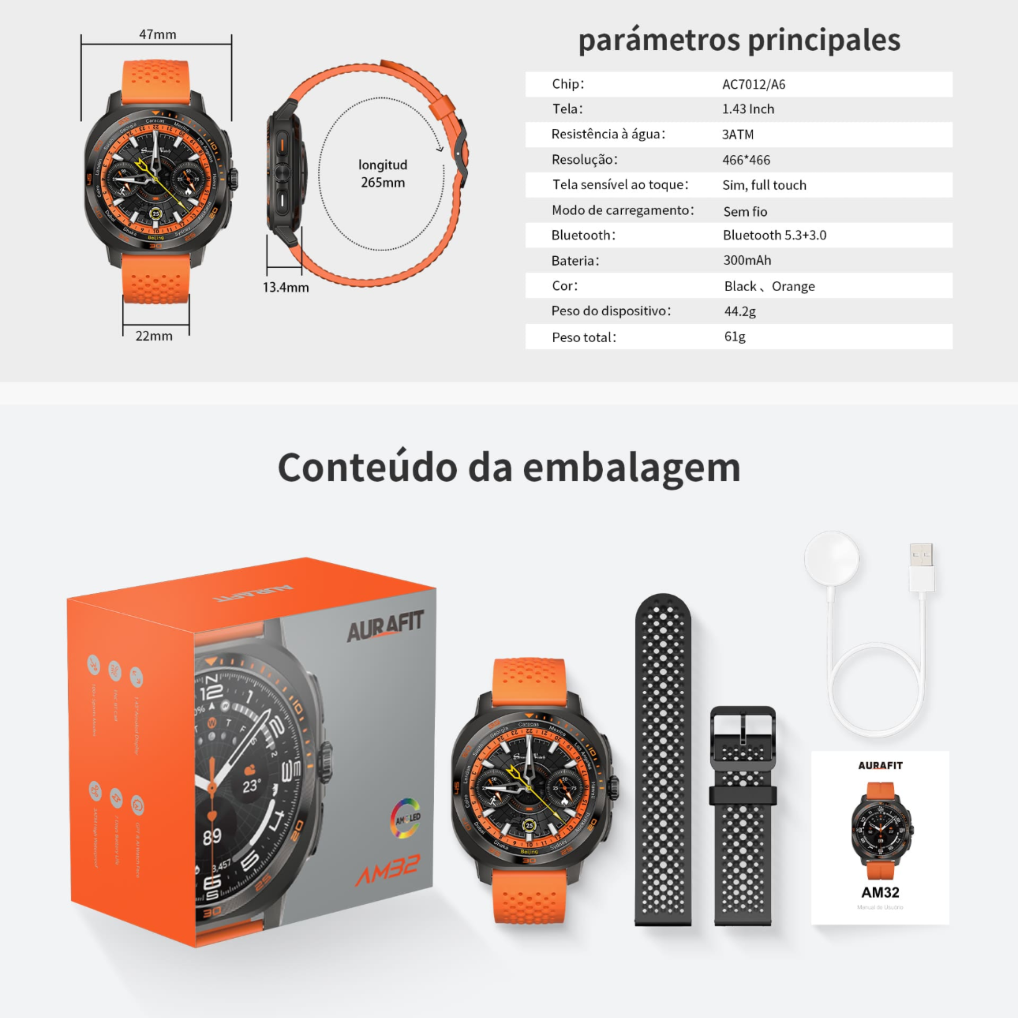 O Smartwatch Aurafit AM32 une design moderno, funções inteligentes e alto desempenho, ideal para quem busca um estilo de vida mais conectado e saudável. Com tela AMOLED de 1,3” em alta resolução (466x466px), bateria de longa duração e mais de 100 modos esportivos, ele foi feito para acompanhar você em todas as situações – do treino ao trabalho, com total praticidade.