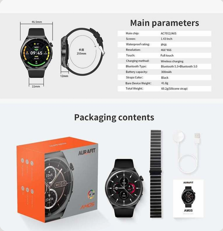 O Smartwatch Aurafit AM05 combina design elegante com funcionalidades tecnológicas de ponta, entregando uma experiência completa para quem busca muito mais do que um relógio. Equipado com uma ampla tela AMOLED de 1,43 polegadas, este modelo oferece alta definição, brilho intenso e excelente fluidez graças à taxa de atualização de 60Hz. Seu corpo é fabricado com moldura metálica de liga de alumínio e coroa giratória em aço inox, o que proporciona durabilidade, conforto e uma aparência premium. O AM05 é um verdadeiro assistente pessoal no seu pulso, com inteligência artificial integrada, chamadas via Bluetooth com cancelamento de ruído, monitoramento contínuo de saúde e carregamento sem fio. Ideal para quem deseja estar conectado e com o bem-estar em dia, sem abrir mão do estilo.